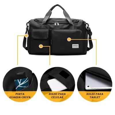 Esta bolsa versátil oferece amplo espaço para todos os seus pertences, sem comprometer o estilo. Com múltiplos compartimentos internos e externos, você pode organizar seus objetos de forma prática e eficiente. Viaje com tranquilidade, sabendo que suas roupas sujas, tênis e outros itens estão separados e protegidos em compartimentos exclusivos.